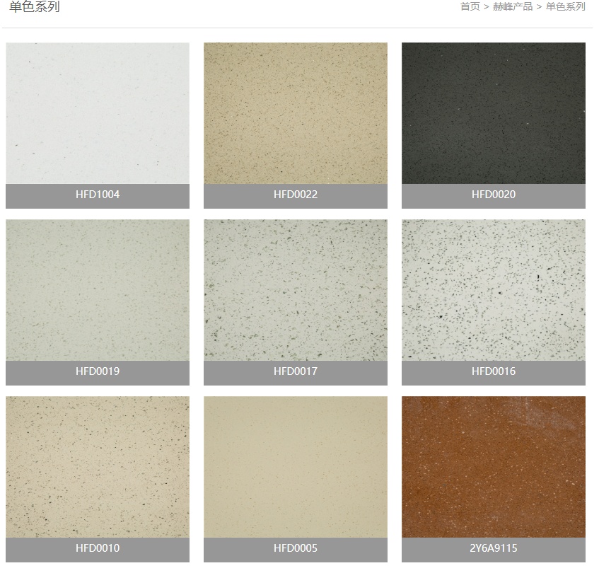 赫峰產品包括石英質玉石、無機型石英石、單色系列、復色系列、花紋系列、玉石系列、寶石系列等。