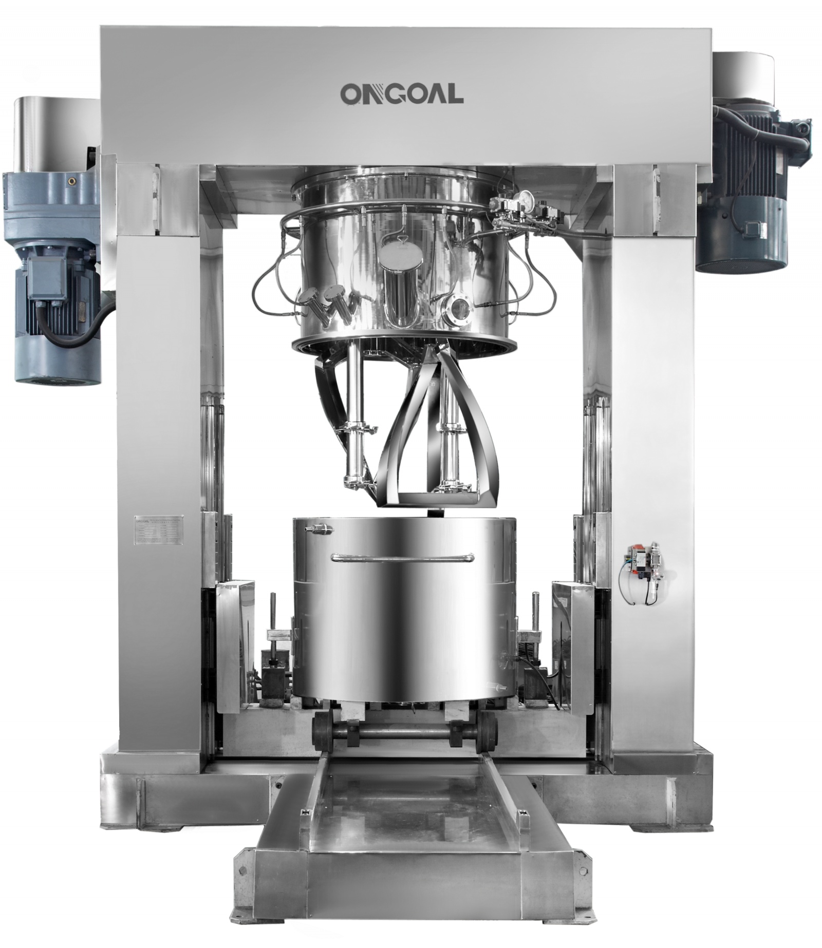雙行星動力攪拌機主要用于粉料和液料之間的攪拌、混合及分散,后得到均勻的漿料。攪拌機的分散盤攪拌槳實現既公轉,又自轉的行星運動,其速度可通過變頻器進行調整。使物料做復雜運動,受到強烈分散和擠壓,保證物料充分分散和混合。