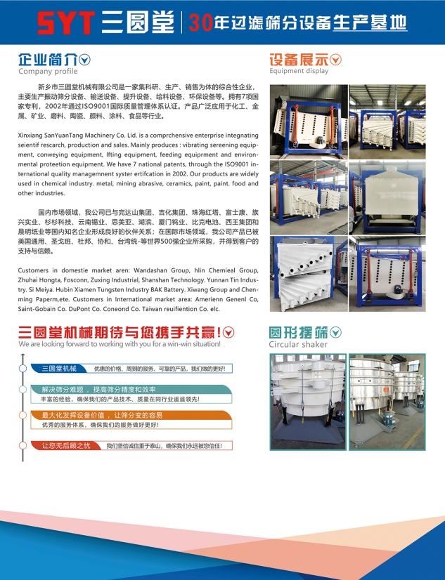 新鄉市三圓堂機械有限公司位于新鄉市高新技術產業區,是一家集科研、生產、銷售于一體的大型振動設備企業。總占地面積8000平方米,5000平方米的標準重型工業廠房,各種金屬加工、鉚焊、裝配設備;現公司有員工100余人,中、高職業技術水平的管理人和技術人員50余人;公司先后引進美國、德國、日本、澳大利亞等國家的優良技術與工藝,公司自成立以來,引進了多臺先進激光切割、智能下料設備,同時建立了先進的生產線和原料加工、定制振動研究室、新型篩分研究室。公司以科學的管理方法,精益求精的制造工藝,勇于創新的制造理念迅速壯大成為中國振動機械生產和出口基地之一。