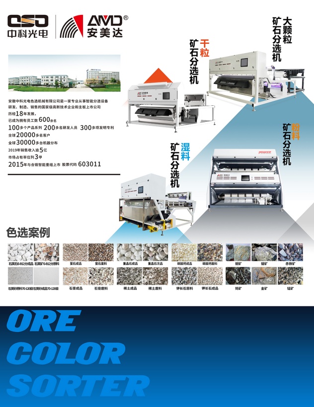 安徽中科光電色選機械有限公司坐落于中國合肥,占地面積15萬平方米,總投資4.5億,員工人數760多人,科研樓25000平方米,是一家專業從事智能分選設備研發、生產、銷售的高新技術企業。歷經十多年的發展,已成為擁有員工超600人,銷售收入逾5億元的大型智能分選設備生產基地?! ?/span>