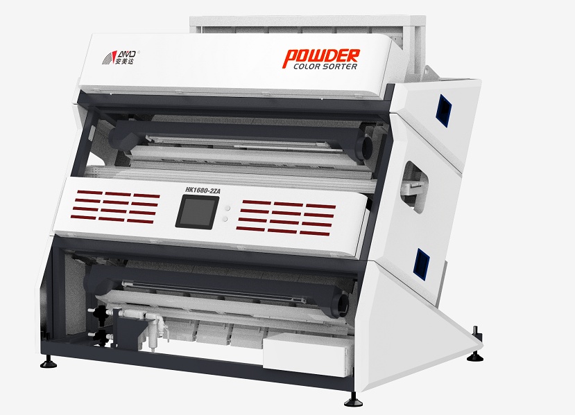 2020年度HK1680-2Z安美達雙層粉料礦石色選機單品銷量占比70%左右,替代市場上的單層及自由落體結構的粉料分選機。