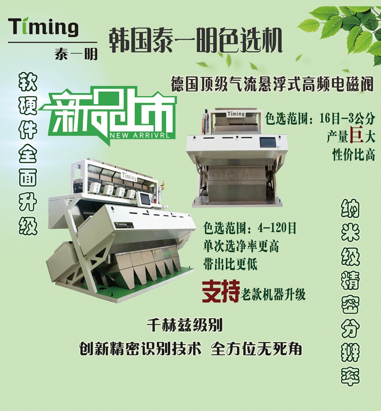 特別近十年來,Timing色選機在鹽、石英砂等細微物料色選技術水平上處于國際領先地位。其中石英砂色選機選效精、產量大、省時節能、穩定性強、可以完成高目數色選。Timing高端的提純技術滿足了各砂廠工業化生產的需求,為色選機的發展做出了突出的貢獻!