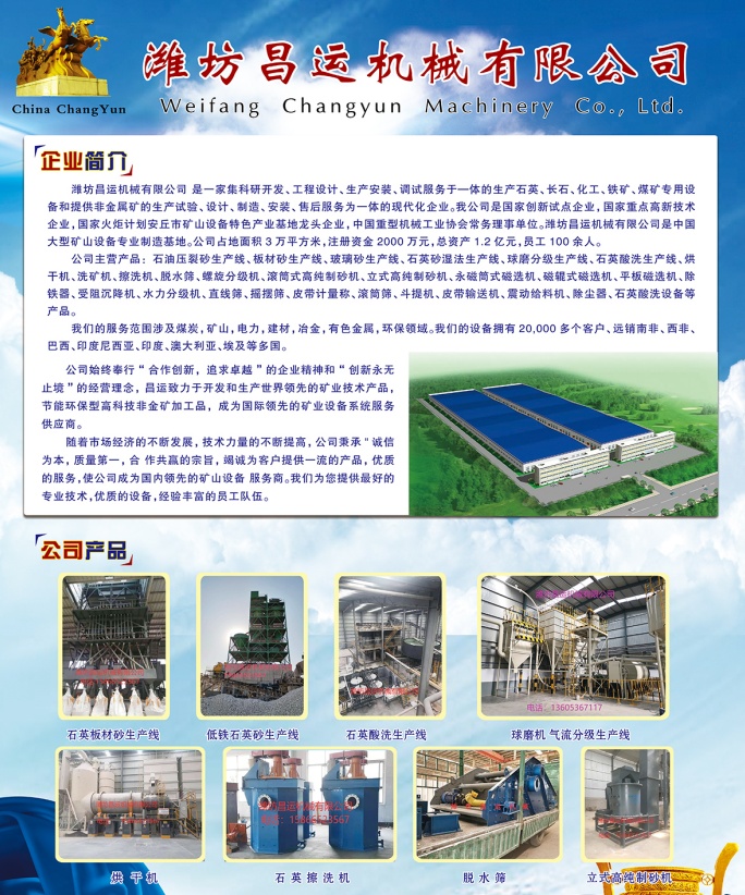 濰坊昌運機械有限公司——是一家集科研開發、工程設計、生產安裝、調試服務于一體的生產石英、長石、化工、鐵礦、煤礦專用設備和提供非金屬礦的生產試驗、設計、制造、安裝、售后服務為一體的現代化企業。服務范圍設計礦山、電力、造紙、玻璃、化工、水泥等行業。