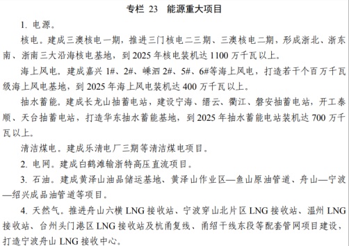 同時,核電列入專欄23“能源重大項目”之中,排在第1位。關于核電,《規劃》表示,建成三澳核電一期,推進三門核電二三期、三澳核電二期,形成浙北、浙東、浙南三大沿海核電基地,到2025年核電裝機達1100萬千瓦以上。