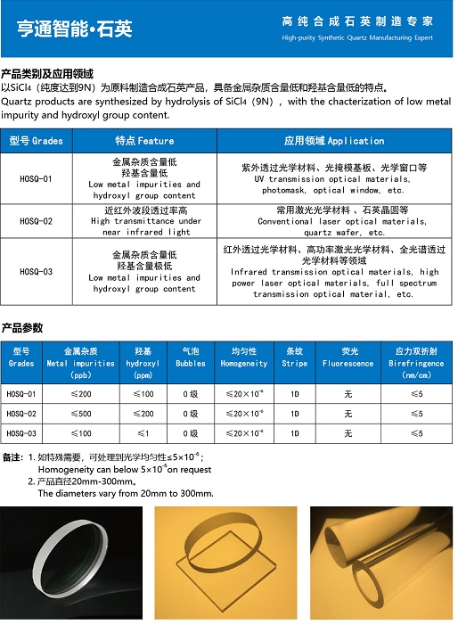 亨通智能石英,是聚焦高端光學石英材料的研發、生產、銷售與服務一體的供應商,致力于確保為客戶提供合格,真實的產品;具有先進技術和豐富制造經驗,主要生產光學石英玻璃、合成石英管等產品。我司自主研發的合成石英玻璃目有純度高、羥基含量低、光學均勻性好等特性,深紫外到紅外區域的透過率高,同時熱膨脹系數低,可應用于半導體光掩模石英基板、LCD掩模石英基板、耐高溫視窗石英材料、紫外透過光學石英材料、紅外透過光學石英材料、激光光學石英材料等多個領域。我們將不斷創新,致力于成為下一代光學石英的技術領導者。