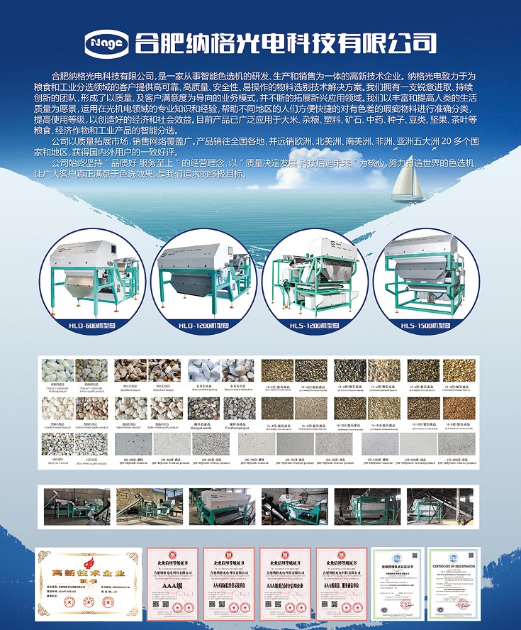 合肥納格光電科技有限公司,是一家從事高端智能色選機的研發、生產和銷售為一體的高新技術企業。 納格光電致力于為糧食和工業分選領域的客戶提供高可靠、高質量、安全性、易操作的物料選別技術解決方案。我們擁有一支銳意進取、持續創新的團隊,形成了以質量、高效及客戶滿意度為導向的業務模式,并不斷的拓展新興應用領域。我們以豐富和提高人類的生活質量為愿景,運用在光機電一體化領域的專業知識和經驗,幫助不同地區的人們方便快捷的對有色差的瑕疵物料進行精確分類,提高使用等級,以創造經濟和社會效益。目前產品已廣泛應用于大米、雜糧、塑料、礦石、中藥、種子、豆類、堅果、茶葉等糧食、經濟作物和工業產品的智能分選。