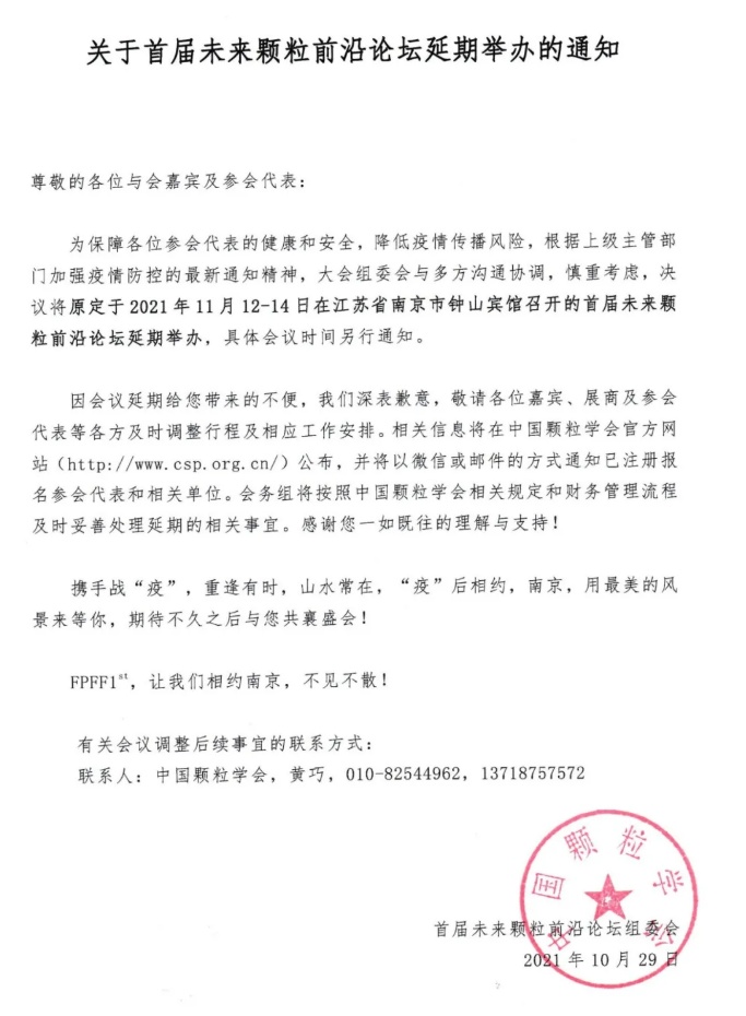 為保障各位參會代表的健康和安全,降低疫情傳播風險,根據上級主管部門加強疫情防控的最新通知精神,大會組委會與多方溝通協調,慎重考慮,決議將原定于2021年11月12-14日在江蘇省南京市鐘山賓館召開的首屆未來顆粒前沿論壇延期舉辦,具體會議時間另行通知。