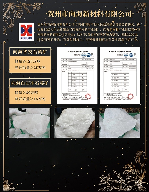 賀州市向海新材料有限公司與賀州市昭平縣人民政府簽訂投資合作協議,擬投資10億元人民幣建設《向海新材料產業園》,向海新材料產業園以賀州市向海新材料有限公司為平臺,以名下2處自有石英礦場為基石,占地1200畝,涉及石英礦開采、石英砂深加工、石英板材制造及石英中高端下游產業。