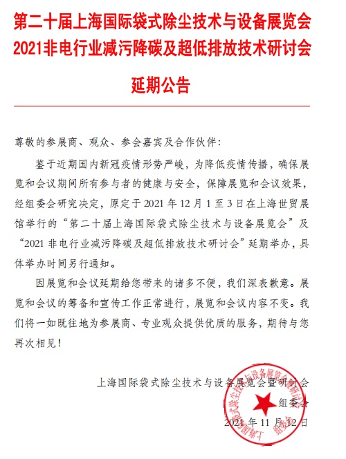 鑒于近期國內新冠疫情形勢嚴峻,為降低疫情傳播,確保展覽和會議期間所有參與者的健康與安全,保障展覽和會議效果,經組委會研究決定,原定于2021年12月1至3日在上海世貿展館舉行的“第二十屆上海國際袋式除塵技術與設備展覽會”及“2021 非電行業減污降碳及超低排放技術研討會”延期舉辦,具體舉辦時間另行通知。