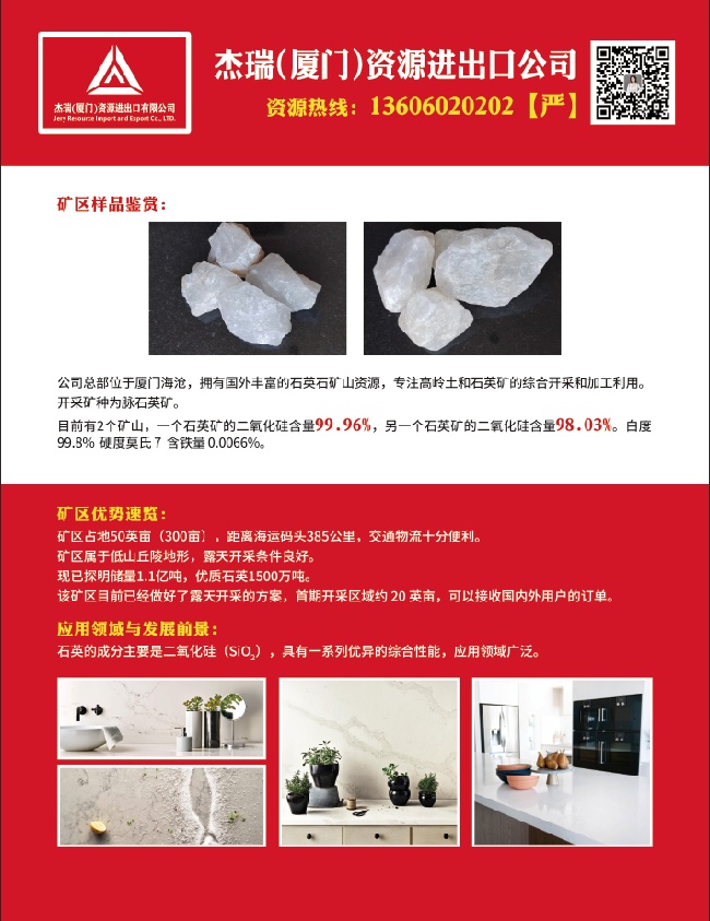 杰瑞(廈門)資源進出口公司,公司總部位于廈門海滄,擁有國外豐富的石英石礦山資源,專注高嶺土和石英礦的綜合開采和加工利用。