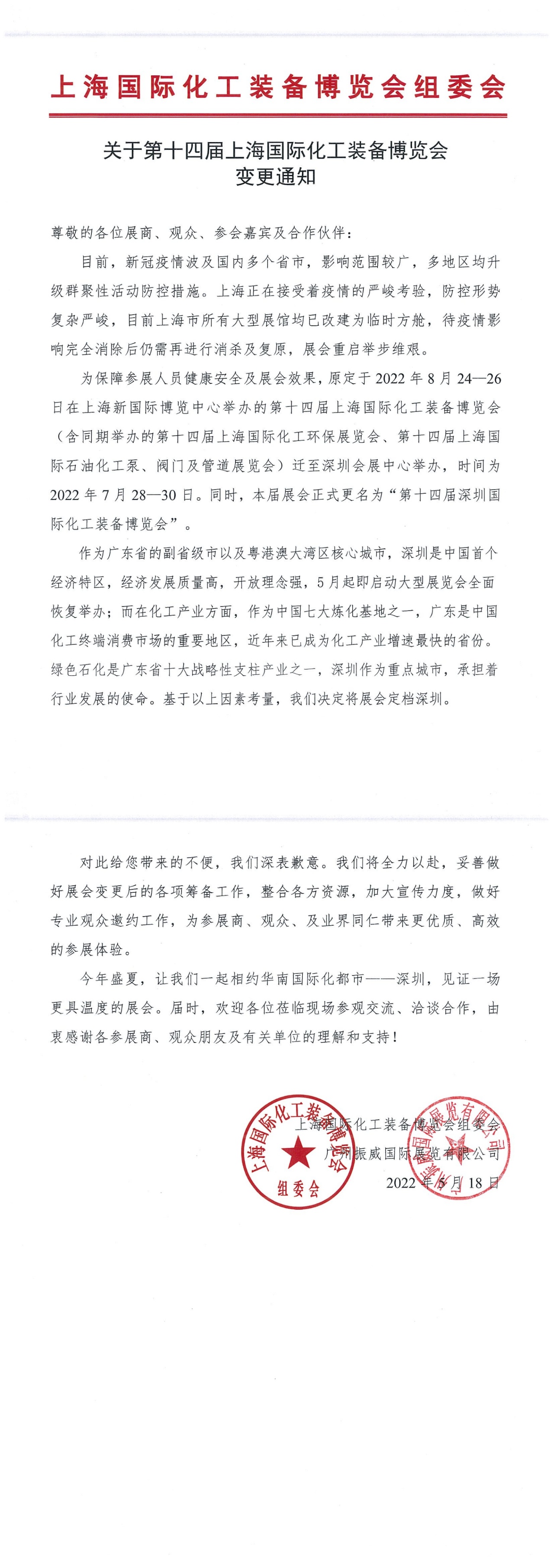 為保障參展人員健康安全及展會效果,原定于2022年8月24-26日在上海新國際博覽中心舉辦的第十四屆上海國際化工裝備博覽會(含同期舉辦的第十四屆上海國際化工環保展覽會、第十四屆上海國際石油化工泵、閥門及管道展覽會)遷至深圳會展中心舉辦,時間為2022年7月28—30日。同時,本屆展會正式更名為“第十四屆深圳國際化工裝備博覽會”。