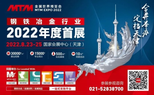由全聯冶金商會、中國耐火材料行業協會、中國鋼結構協會鋼管分會、天津市金屬材料行業協會、天津市線材制品行業協會、天津市鑄鍛行業協會、上海市金屬學會、上海鋼管行業協會、寶山鋼鐵股份有限公司等單位共同主辦的“2022MTM金屬世界博覽會·天津”將于2022年8月23-25日在國家會展中心(天津)舉辦。