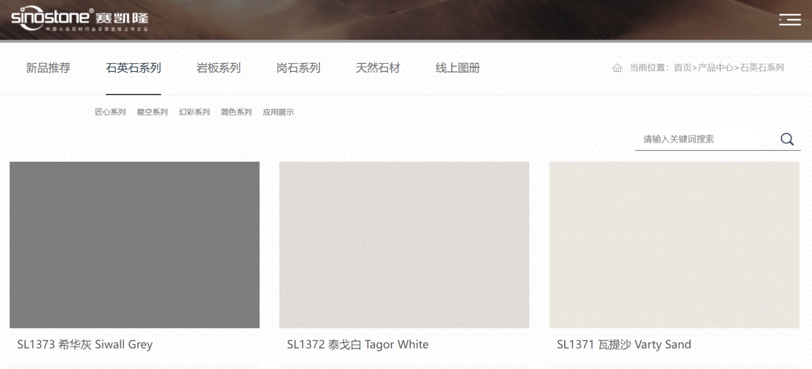 公司擁有佛山兩大制造基地與中旗人造石研究院。旗下品牌sinostone賽凱隆產品專注為全球領先廚衛(wèi)品牌服務,擁有四大系列,近300多種顏色,是大型工程、廚房、衛(wèi)浴、家居裝飾等家裝和工裝的優(yōu)選石英石材料,在業(yè)內享有很高的知名度及美譽度。