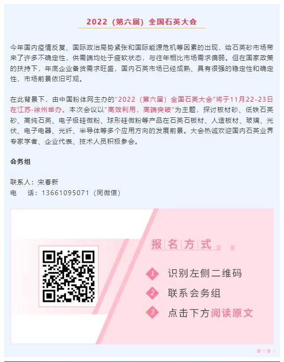 由中國粉體網主辦的“2022(第六屆)全國石英大會”將于11月22-23號在江蘇·徐州舉辦,寶雞皓順硅業有限公司邀您一同參加。