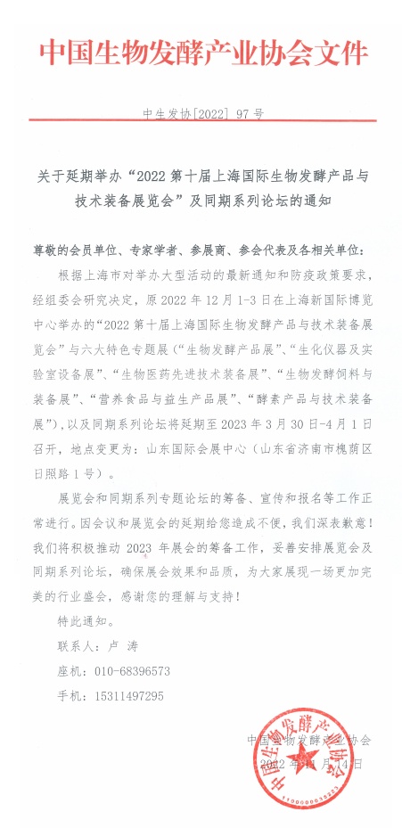 關于延期舉辦“2022第十屆上海國際生物發酵產品與技術裝備展覽會”及同期系列論壇的通知