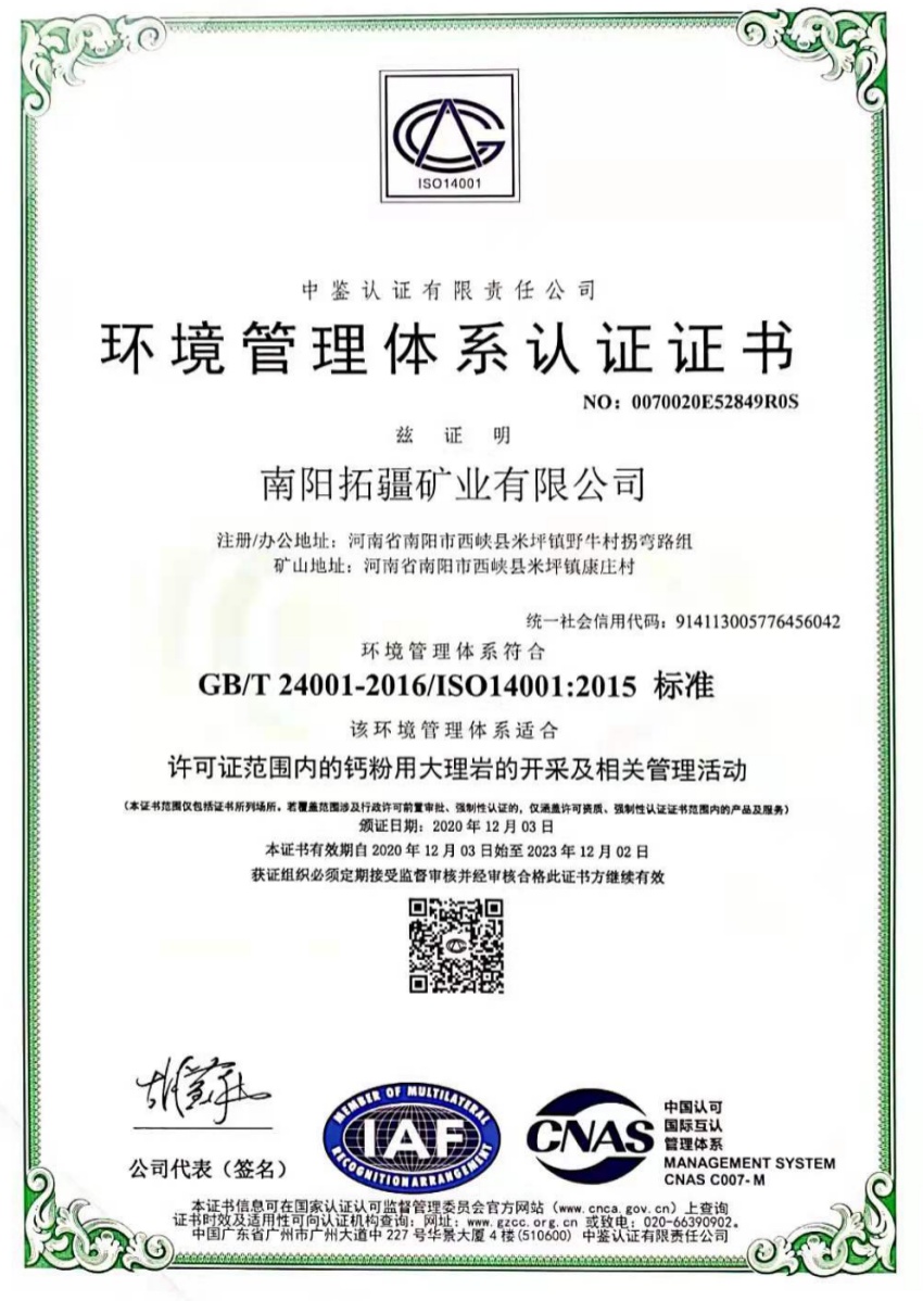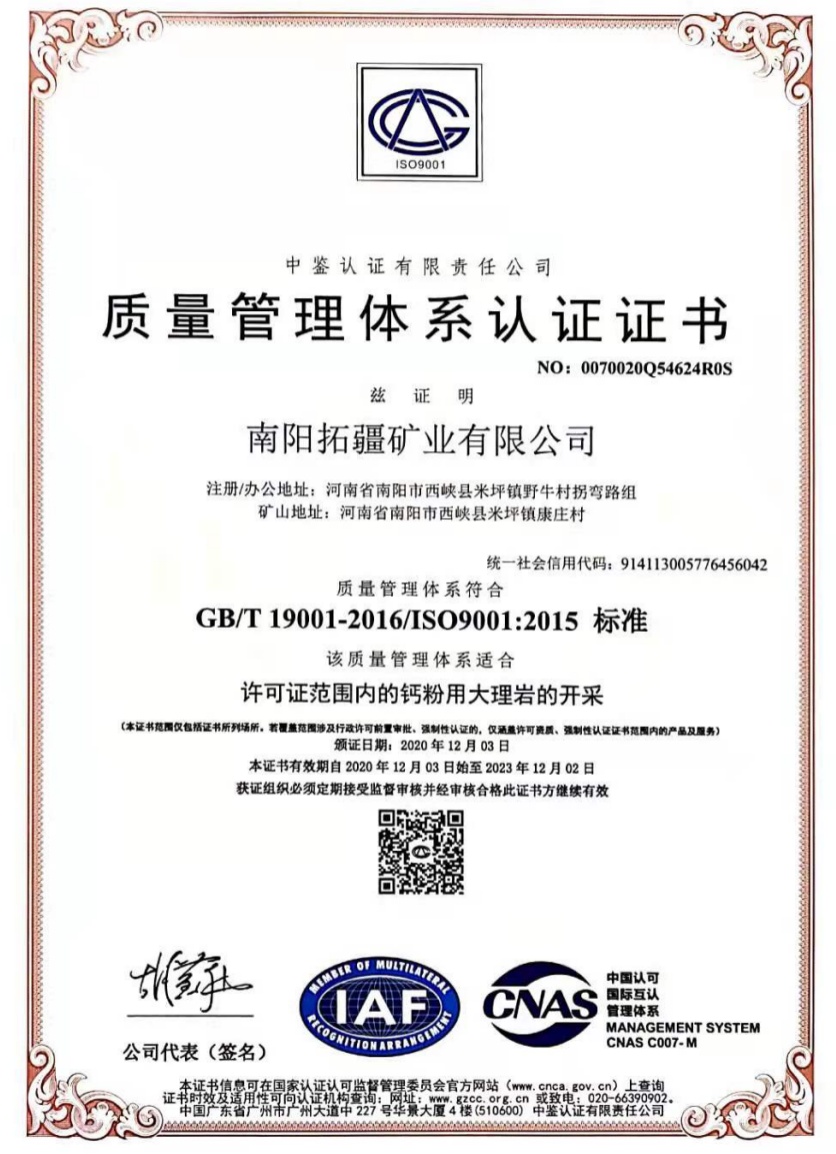 南陽(yáng)拓疆礦業(yè)有限公司,位于南陽(yáng)市西峽縣米坪鎮(zhèn)野牛村,成立于2011年,注冊(cè)資金1000萬(wàn)元。2017年通過(guò)股權(quán)變更,經(jīng)現(xiàn)在實(shí)際經(jīng)營(yíng)者擴(kuò)建、改建后是目前西峽縣規(guī)模較大的一家大理巖開(kāi)采加工企業(yè)。本公司集礦石開(kāi)采、礦石加工、鈣粉銷(xiāo)售于一體,公司占地42000平方米,職工32人,其中具有安全職稱(chēng)6人。