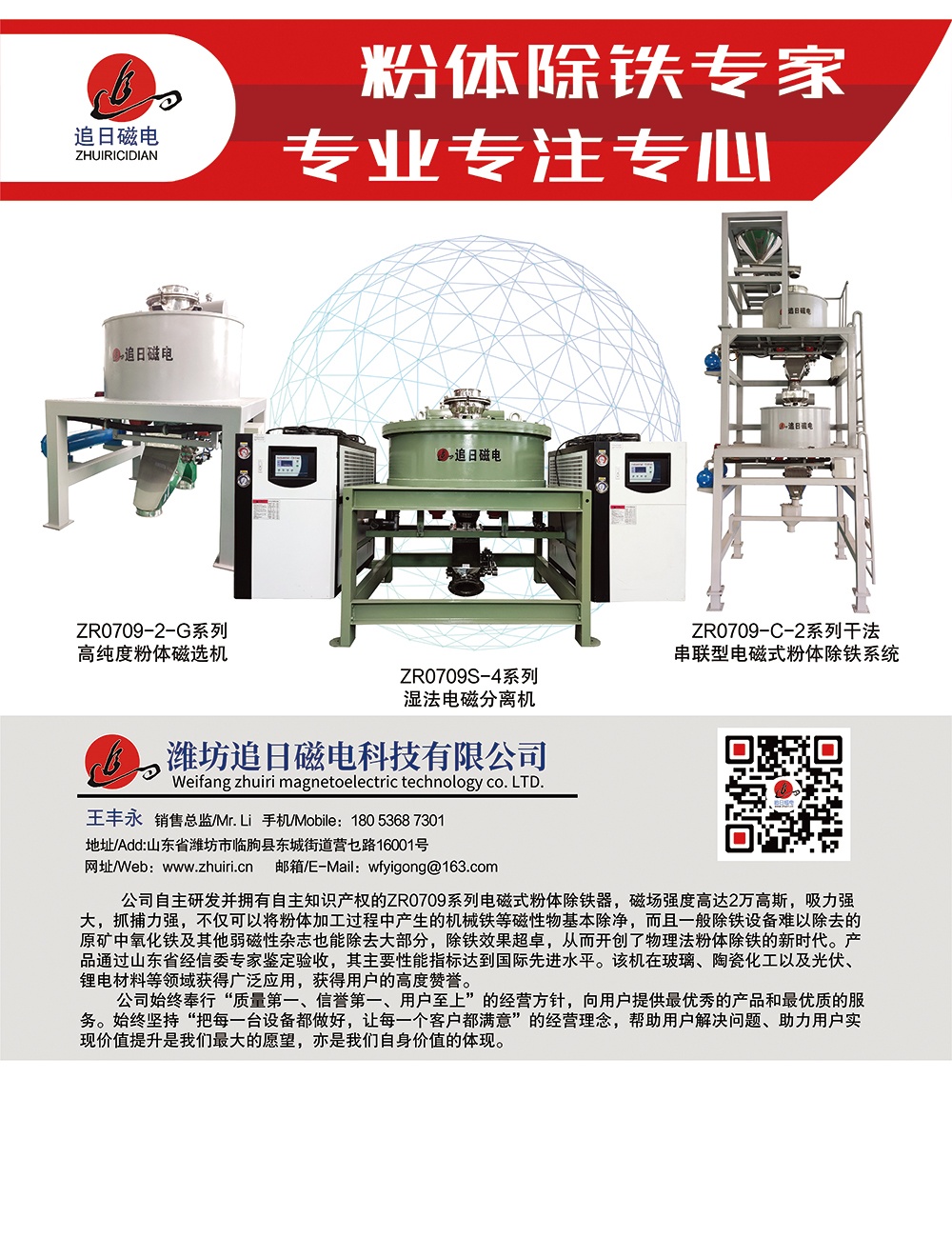 濰坊追日磁電科技有限公司是一家專業從事磁力分選和機電一體化設備的研制、生產和銷售的高科技企業,地處魯中地區樞紐地帶,交通便利。