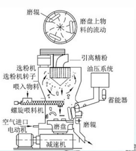 通過減速機帶動磨盤轉動,使磨盤中央的物料在離心力的作用下向邊緣勻速移動,經(jīng)過磨盤上的輥道時,受磨輥碾壓,大塊物料直接被壓碎,細物料受擠壓后形成料層,進行粒間粉碎。粉碎后的物料繼續(xù)向磨盤邊緣移動,直到被磨盤外圍的噴口環(huán)引導的強氣流向上帶走,進入主機上方的分級系統(tǒng)進行篩選分級;較粗的物料由于自身重力原因重新落回至磨盤內,進行再次碾磨。