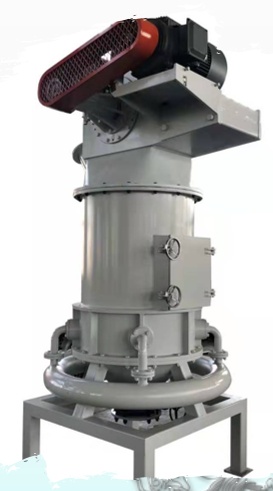 是壓縮空氣經(jīng)拉瓦爾噴咀加速成超音速氣流后射入粉碎區(qū)使物料呈流態(tài)化(氣流膨脹呈流態(tài)化床懸浮沸騰而互相碰撞),因此每一個顆粒具有相同的運動狀態(tài)。在粉碎區(qū),被加速的顆粒在各噴咀交匯點相互對撞粉碎。粉碎后的物料被上升氣流輸送至分級區(qū),由水平布置的分級輪篩選出達到粒度要求的細粉,未達到粒度要求的粗粉返回粉碎區(qū)繼續(xù)粉碎。合格細粉隨氣流進入高效旋風分離器得到收集,含塵氣體經(jīng)收塵器過濾凈化后排入大氣。