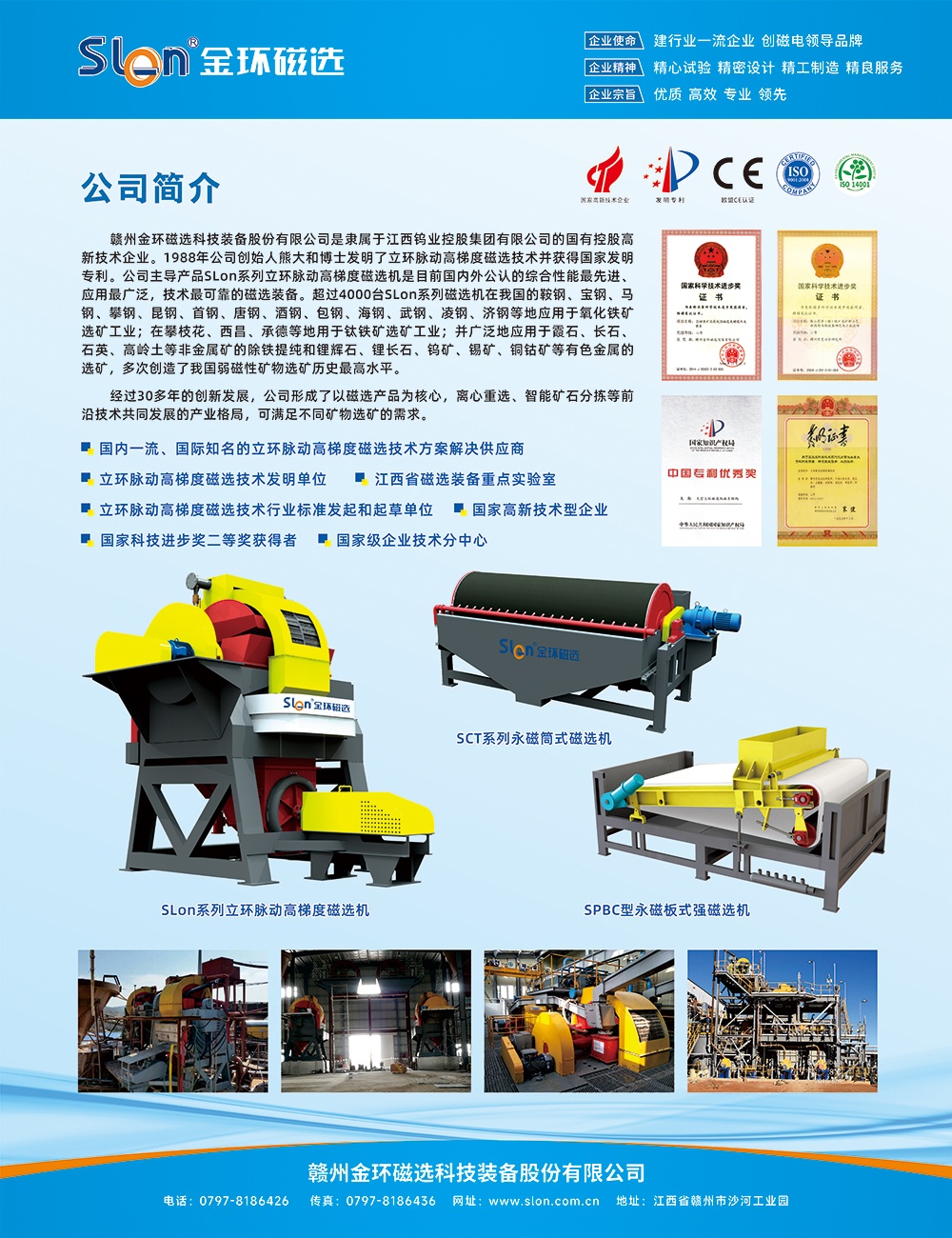 贛州金環磁選設備有限公司隸屬于江西鎢業控股集團有限公司,企業前身是贛州有色冶金研究所設備研究室,2001年5月由科研院所改制成立了贛州立環磁電設備高技術有限責任公司,2005年11月落戶贛州市章貢區沙河工業園并更名為贛州金環磁選設備有限公司。