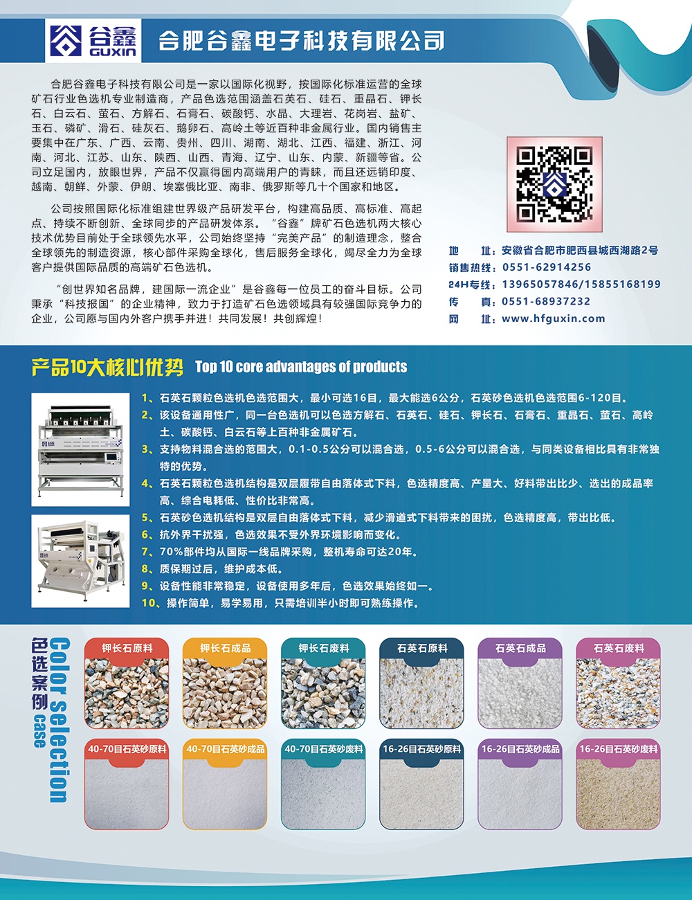 合肥谷鑫電子科技有限公司是一家以國際化視野,按國際化標準運營的礦石行業色選機專業制造商,產品色選范圍涵蓋石英石、硅石、重晶石、鉀長石、白云石、螢石、方解石、石膏石、碳酸鈣、水晶、大理巖、花崗巖、鹽礦、玉石、磷礦、滑石、硅灰石、鵝卵石、高嶺土等近百種非金屬行業。國內銷售主要集中在廣東、廣西、云南、貴州、四川、湖南、湖北、江西、福建、浙江、河南、河北、江蘇、山東、陜西、山西、青海、遼寧、山東、內蒙、新疆等省。公司立足國內產品不僅贏得國內高端用戶的青睞,而且還遠銷印度、越南、朝鮮、外蒙、伊朗、埃塞俄比亞、南非、俄羅斯等幾十個國家和地區。