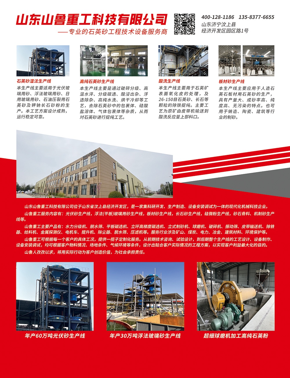 山東山魯重工科技有限公司位于山東省汶上縣經濟開發區,是一家集科研開發、生產制造、設備安裝調試為一體的現代化機械科技企業。山魯重工服務內容有:光伏砂生產線,浮法(平板)玻璃用砂生產線,板材砂生產線,長石砂生產線,硅微粉生產線,砂石骨料、機制砂生產線等。