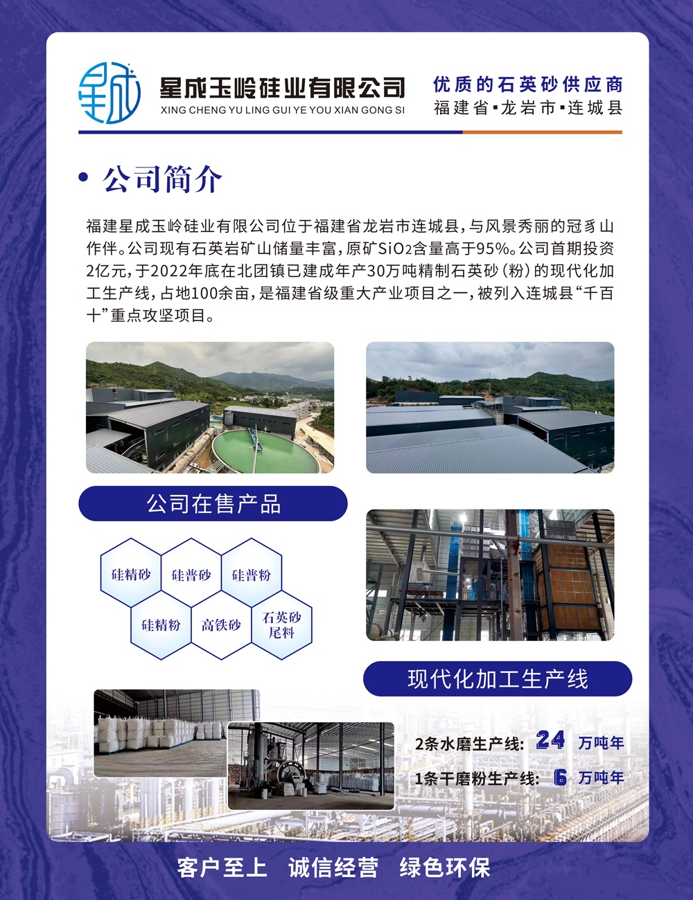 福建星成玉嶺硅業有限公司位于福建省龍巖市連城縣,與風景秀麗的冠豸山作伴。公司現有石英巖礦山儲量豐富,原礦SiO₂含量高于95%。公司首期投資2億元,于2022年底在北團鎮已建成年產30萬噸精制石英砂(粉)的現代化加工生產線,占地100余畝,是福建省級重大產業項目之一,被列入連城縣“千百十”重點攻堅項目。公司生產的石英砂產品廣受客戶好評。公司秉承客戶至上、誠信經營、綠色環保的理念,在保障安全生產的前提下,不斷提升、優化產品,滿足客戶用砂需求,保障客戶無憂生產,為石英產業發展貢獻自己的一份力量。