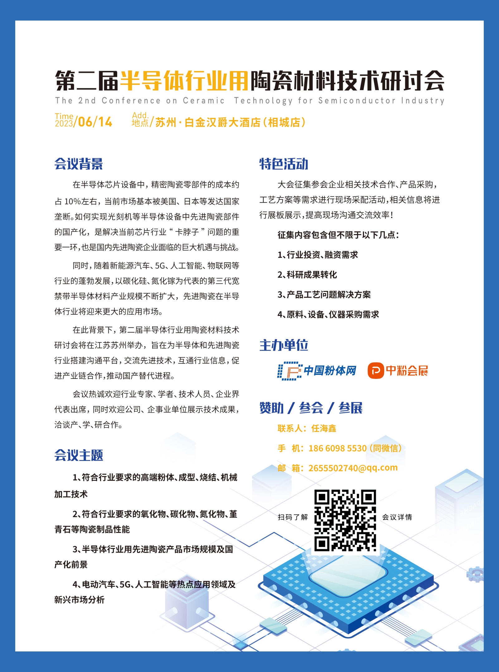 從第二屆半導體行業用陶瓷材料技術研討會組委會獲悉,本屆會議將于2023年6月14日在蘇州舉辦。錦州海鑫金屬材料有限公司作為參展單位邀請您共同出席。