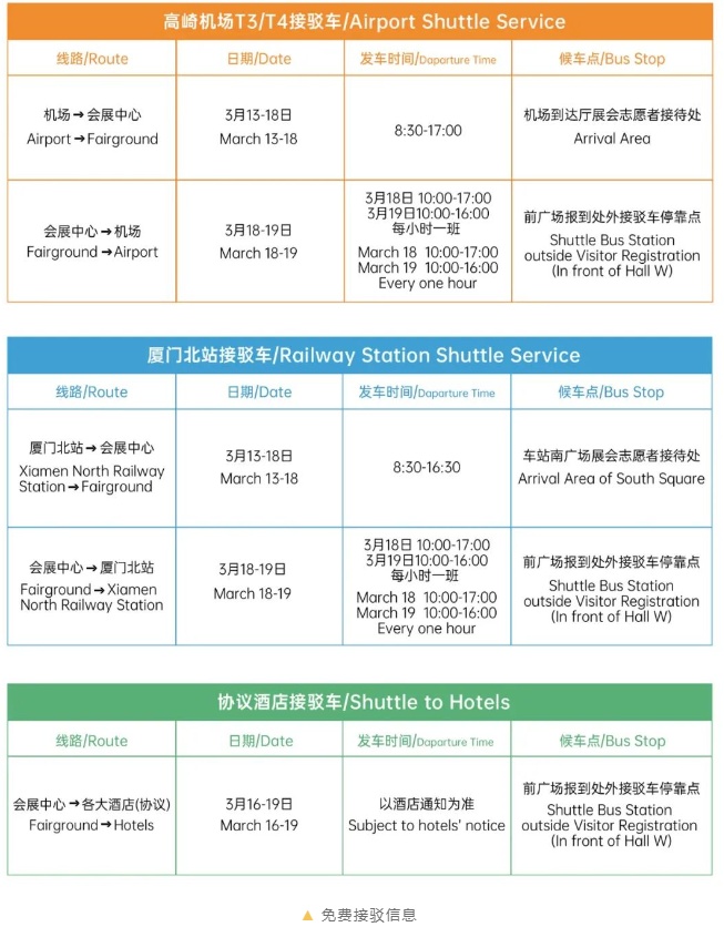 廈門國際會展中心位于廈門島東部,距廈門高崎國際機場14公里,廈門站8.7公里,廈門北站27.9公里。抵達廈門后,您可乘坐免費接駁車、公共交通(公交車、BRT快速公交、地鐵)、出租車或自駕到達展館,展館周邊設有若干臨時停車場,如您自駕前來請留意路邊指示牌。