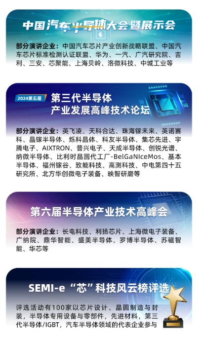精準把握市場趨勢,展會同期舉辦四大主題峰會,覆蓋第三代半導體、汽車半導體半導體產業技術等領域話題,匯聚專家大咖探討行業發展趨勢,資訊分享和熱點互動,現場帶來市場趨勢解碼、挖掘更多“芯”思路,推進產能擴充,優質資源深度對接。
