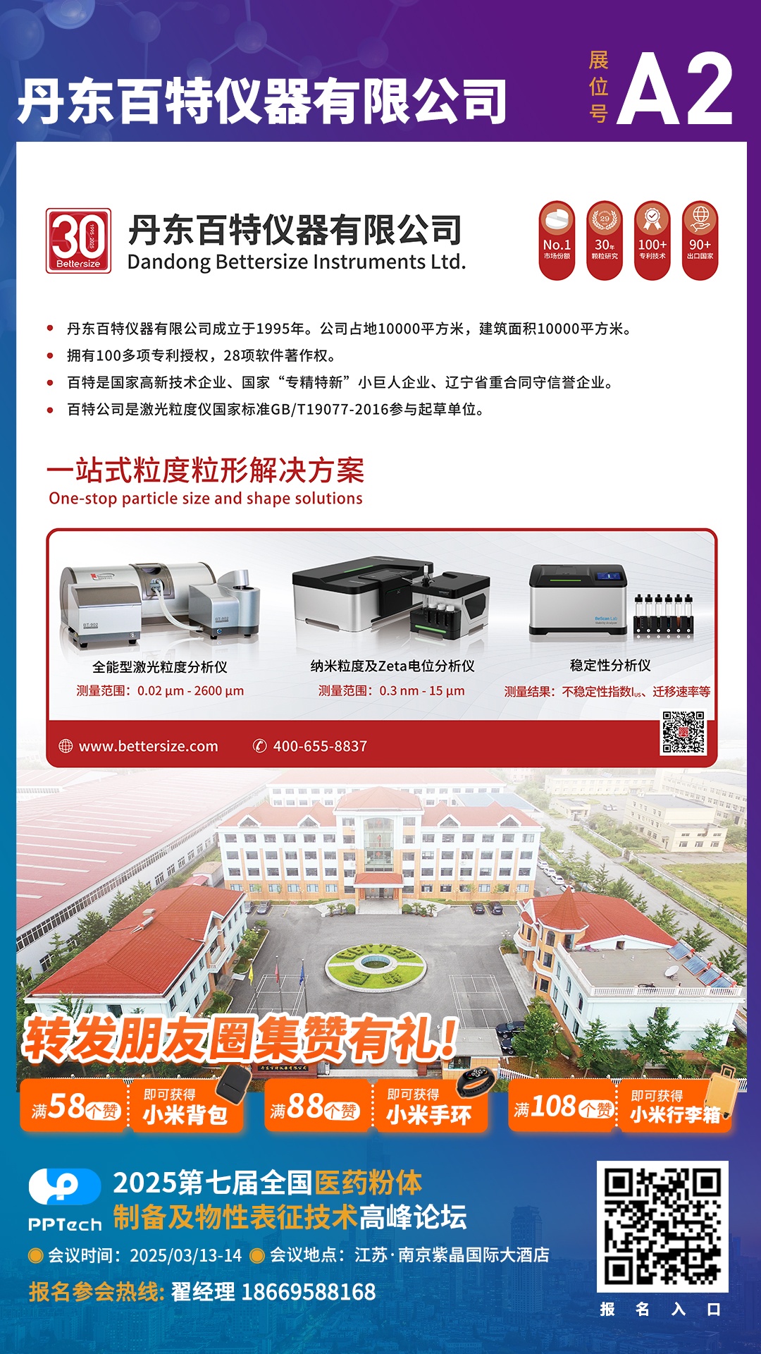 從第七屆全國醫藥粉體制備及物性表征技術高峰論壇組委會獲悉,本屆會議將于2025年3月13-14日在南京舉辦。丹東百特儀器有限公司作為參展單位邀請您共同出席。