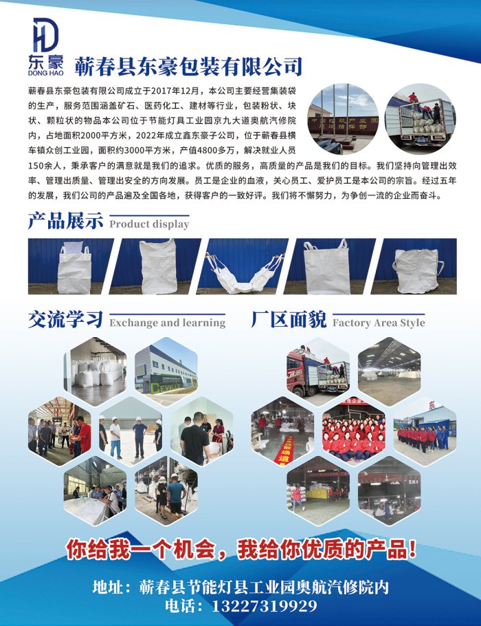蘄春縣東豪包裝有限公司成立于2017年12月,本公司主要經營集裝袋的生產,服務范圍涵蓋礦石、醫藥化工、建材等行業,包裝粉狀、塊狀、顆粒狀的物品本公司位于節能燈具工業園京九大道奧航汽修院試瑜探部內,占地面積2000平方米,2022年成立鑫東豪子公司,位于春縣橫車鎮眾創工業園,面積約3000平方米,產值4800多萬,解決就業人員150余人,秉承客戶的滿意就是我們的追求。優質的服務,高質量的產品是我們的目標。我們堅持向管理出效率、管理出質量、管理出安全的方向發展。員工是企業的血液,關心員工、愛護員工是本公司的宗旨。經過五年的發展,我們公司的產品遍及全國各地,獲得客戶的一致好評。公司將不懈努力,為爭創一流的企業而奮斗。