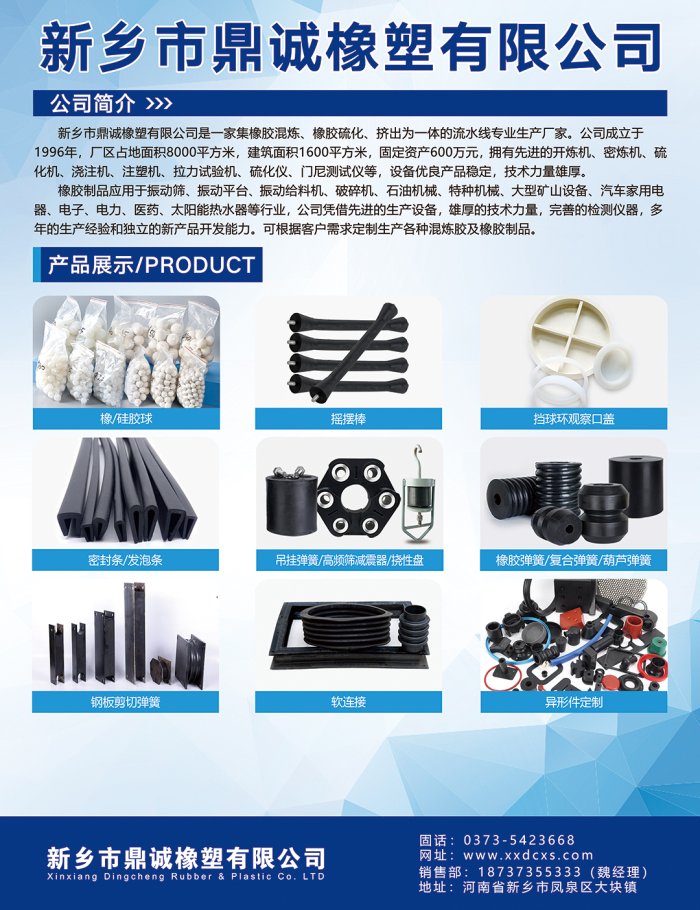 新鄉市鼎誠橡塑有限公司是一家集橡膠混煉、橡膠硫化、擠出為一體的流水線專業生產廠家。公司成立于1996年,廠區占地面積8000平方米,建筑面積1600平方米,固定資產600萬元,擁有先進的開煉機、密煉機、硫化機、澆注機、注塑機、拉力試驗機、硫化儀、門尼測試儀等,設備優良產品穩定,技術力量雄厚。橡膠制品應用于振動篩、振動平臺、振動給料機、破碎機、石油機械、特種機械、大型礦山設備、汽車家用電器、電子、電力、醫藥、太陽能熱水器等行業,公司憑借先進的生產設備,雄厚的技術力量,完善的檢測儀器,多年的生產經驗和獨立的新產品開發能力。可根據客戶需求定制生產各種混煉膠及橡膠制品。