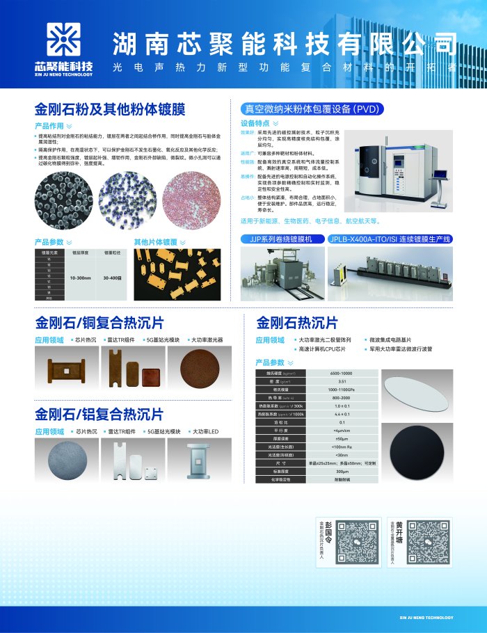 湖南芯聚能科技有限公司總部位于湖南長沙,技術源起為中南大學氣相沉積技術與薄膜材料研究室(1999年成立,致力于光電聲熱力新型功能復合材料開發20余年),是國內*早開展CVD金剛石和金屬基復合溫控材料研究的科研團隊之一。針對國家重大科技創新需求和新一代電子元件散熱問題,通過材料、工藝、技術及裝備多維度聯合,系統研究了CVD金剛石大面積高品質制備工藝、導熱顆粒增強金屬基復合材料界面控制技術、多維度金剛石/金屬復合界面的設計理論及材料制備原理,形成了高性能復合溫控材料制備成型一體化技術以及低成本穩定量產工藝,擁有國際先進、國內**的高性能溫控材料低成本、量化制備技術和成套生產裝備。