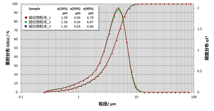 在實際測試中,我們對硫化物固態電解質粉末進行了3次連續測試,結果顯示其D50值穩定在4微米,且測試分布情況基本一致,充分證明了設備的高精度和優異的重復性。
