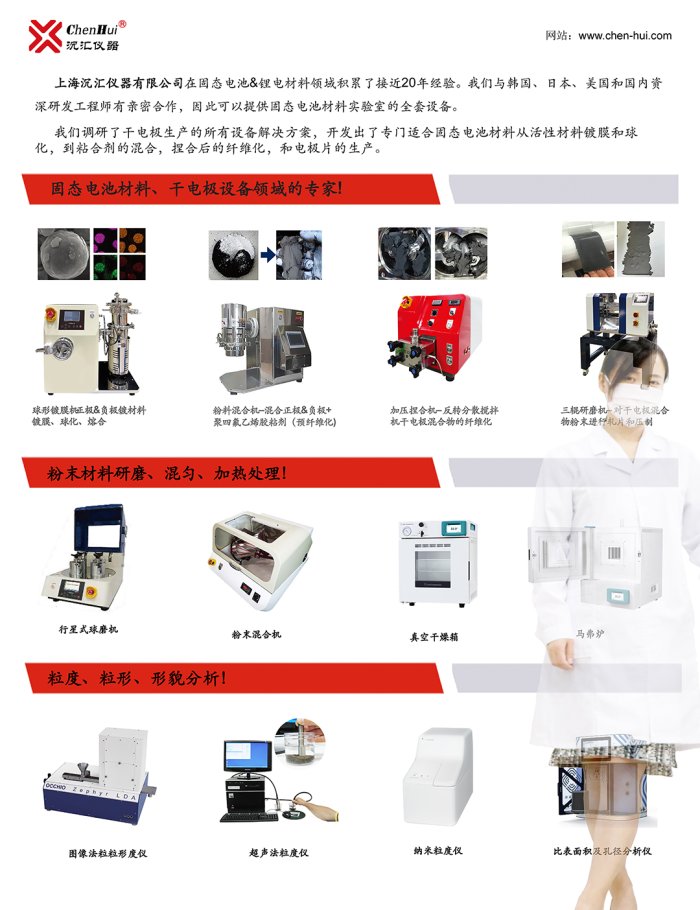 上海沉匯儀器有限公司在固態電池&鋰電材料領域積累了接近20年經驗。我們與韓國、日本、美國和國內資深研發工程師有親密合作,因此可以提供固態電池材料實驗室的全套設備。