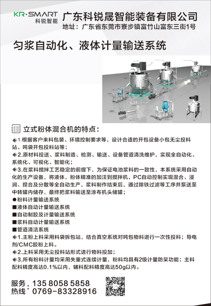 科銳創(chuàng)始于2006年,歷經(jīng)多年穩(wěn)健發(fā)展,在2025年榮耀升級(jí),正式蛻變成為廣東科銳晟智能裝備有限公司。總部位于廣東省東莞市寮步鎮(zhèn),是一家集研發(fā)、生產(chǎn)、銷售、服務(wù)于一體的新能源鋰電裝備國家級(jí)高新技術(shù)企業(yè)。公司以高粘度攪拌、干燥、研磨、分散及智能化輸送系統(tǒng)為核心技術(shù),產(chǎn)品覆蓋鋰電軟體工程全領(lǐng)域,包含智能動(dòng)力攪拌機(jī)、真空干燥機(jī)、砂磨機(jī)等,還提供MES系統(tǒng)及物流輸送系統(tǒng)。我們?yōu)榭蛻籼峁┪锪咸幚碜詣?dòng)化一站式解決方案,從拆包投料、物料存儲(chǔ)到智能控制,全流程覆蓋。公司產(chǎn)品廣泛應(yīng)用于新能源行業(yè)、復(fù)合材料、膠黏劑、醫(yī)藥、日化、食品、涂料、5G材料、半導(dǎo)體材料等多個(gè)領(lǐng)域,滿足各類個(gè)性化定制需求。