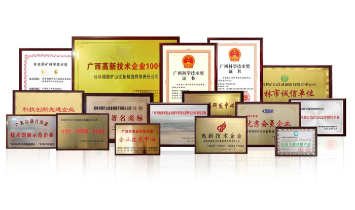 桂林鴻程先后榮獲“高新技術企業”、“國家知識產權優勢企業”、“廣西工業龍頭企業”、“廣西制造業單項冠軍示范企業”、“廣西科技進步獎一等獎”等稱號,榮獲擺式磨粉機分級機、磨粉機開路收集系統、磨粉機布袋收集系統、環輥磨減震基礎、雷蒙磨主機內分料結構、磨粉機遠程智能監控系統等在內的專利證書。