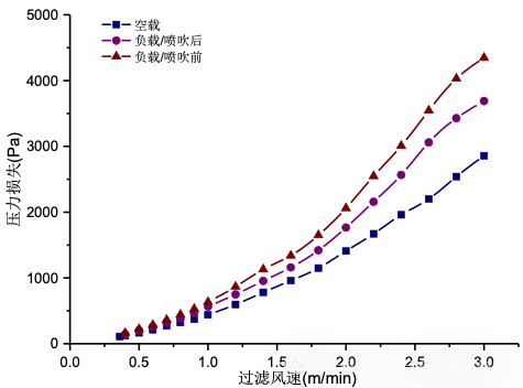 負(fù)載/噴吹前為使用狀態(tài)下噴吹不工作時流量-壓損關(guān)系;