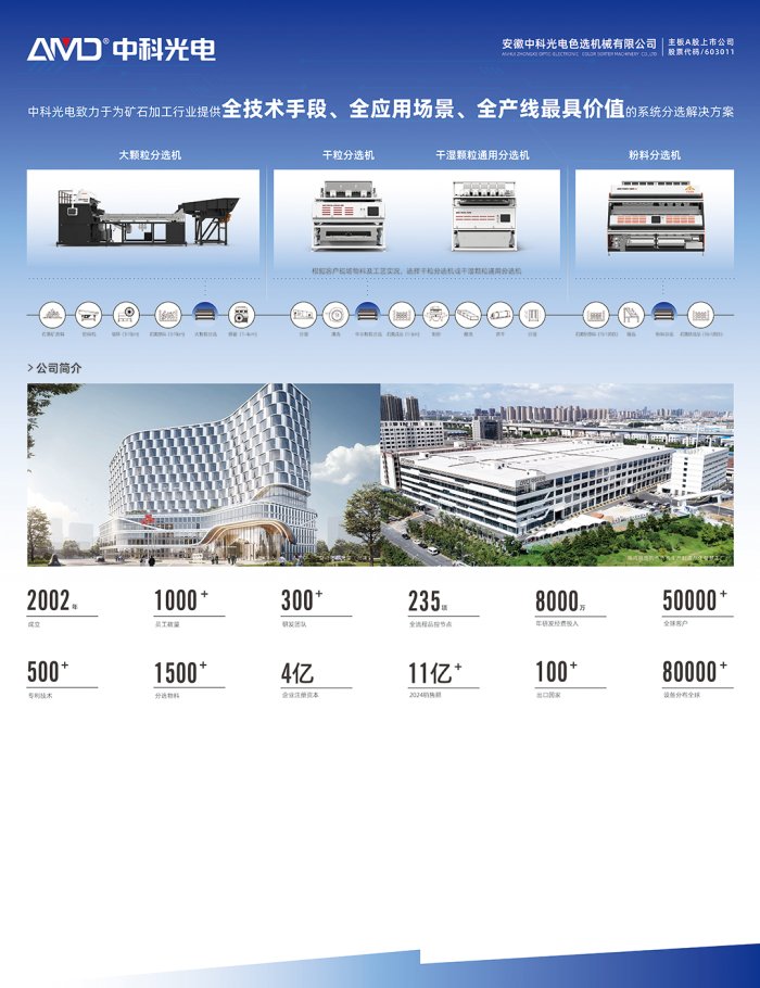 安徽中科光電色選機械有限公司坐落于中國合肥,占地面積15萬平方米,總投資4.5億,員工人數760多人,科研樓25000平方米,是一家專業從事智能分選設備研發、生產、銷售的高新技術企業。歷經十多年的發展,已成為擁有員工超600人,銷售收入逾5億元的大型智能分選設備生產基地。 公司全面通過了質量管理體系認證、環境管理體系認證、職業健康管理體系認證,“安美達”系列產品通過了歐盟CE認證。嚴格的質量管理體系保障了公司產品和服務的質量,在全國乃至世界打響了“安美達”品牌?!吧x,我們無處不在”是中科光電對于色選技術的追求和承諾。“安美達”牌系列智能色選機市場份額位列三甲,并成功遠銷一百多個國家和地區。 公司成立專門研發中心并被認定授予“安徽省企業技術中心”和“博士后科研工作站”,且與合肥工業大學共建智慧辨識與分揀工程技術中心。先后獲得自主知識產權近48項,高新技術產品6項,并參與制定3項安徽省地方標準?!鞍裁肋_”品牌被認定為“中國馳名商標”、“安徽省著名商標”。公司先后被認定為“國家高新技術企業”、“安徽省知識產權優勢企業”、“合肥市知識產權示范企業”、“合肥市兩化融合示范企業”、“合肥市創新型企業”。