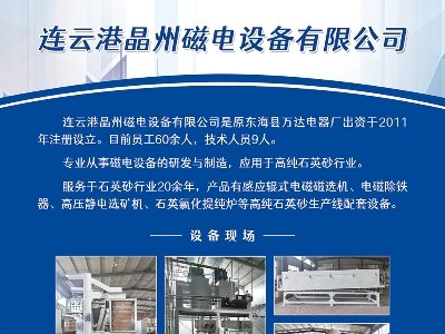 中國粉體網于2024年3月29日在安徽蕪湖舉辦“第二屆光伏行業用石英砂技術與市場交流大會”,晶州磁電邀您一同參加。展位號:B9企業介紹連云港晶州磁電設備有限公司從事磁電設備的研發與制造,企業引進國外一