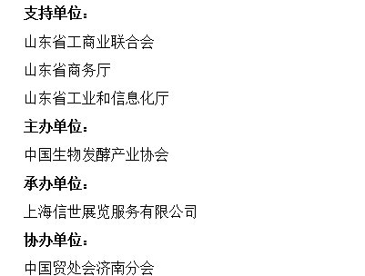 支持單位:山東省工商業(yè)聯(lián)合會山東省商務(wù)廳山東省工業(yè)和信息化廳主辦單位:中國生物發(fā)酵產(chǎn)業(yè)協(xié)會承辦單位:上海信世展覽服務(wù)有限公司協(xié)辦單位:中國貿(mào)處會濟(jì)南分會山東省生物發(fā)酵產(chǎn)業(yè)協(xié)會山東省水處理協(xié)會江南大學(xué)食