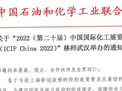 關于“2022(第二十屆)中國國際化工展覽會(ICIF China2022)”移師武漢舉辦的通知尊敬的參展商、觀眾、合作伙伴及業界同仁:鑒于當前上海新冠疫情的防控政策要求及展館的實際情況,為遵守國家及