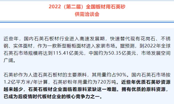 6月28號,“2022(第二屆)全國板材用石英砂供需洽談會”將在廣東·佛山南海保利皇冠假日酒店舉行,華建硅砂邀您一同參加。展位號:D8企業介紹華建硅砂由長期從事石英砂石深加工的專家、企業家組成。華建硅