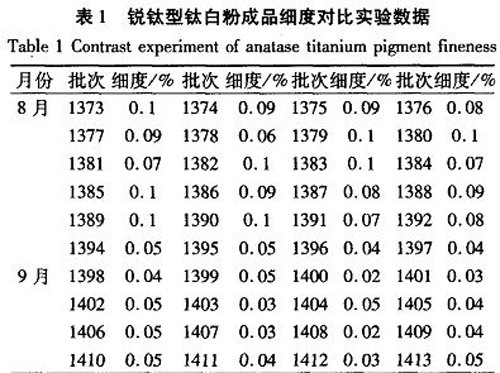 以上改進措施已于2008年8月在中鹽株洲化工集團鈦白粉廠完成實施,9月份我們對銳鈦型鈦白粉成品細度做了跟蹤實驗,并與改進前進行了對比。實驗數據見表1。