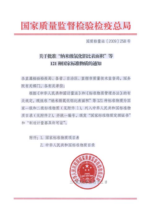 納米氧化鋁比表面積標(biāo)準(zhǔn)物質(zhì)制造計(jì)量器具許可證號:國制標(biāo)物10000945;
