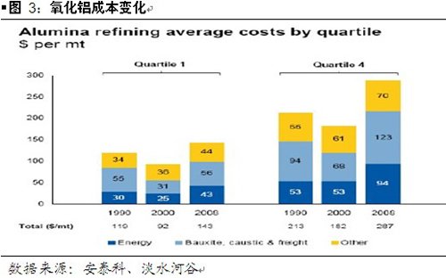 變革后的氧化鋁的定價模式價格一是要反映供需面,二是反映成本的變化。從該圖可以看出,氧化鋁的價格主要受礬土礦、能源等原材料價格的影響,不同時間段差別較大。但目前的長協(xié)定價跟隨三月期鋁價格,而三月期鋁價格反映的是電解鋁的供求關(guān)系及投資者對于未來市場趨勢的預(yù)期,與氧化鋁的成本關(guān)系很小。當(dāng)電解鋁行業(yè)產(chǎn)能過剩,發(fā)生階段性大幅下挫時,氧化鋁價格的下跌在所難免,這就會損害到氧化鋁供應(yīng)商的利益,也是他們提出定價模式改革的原因。