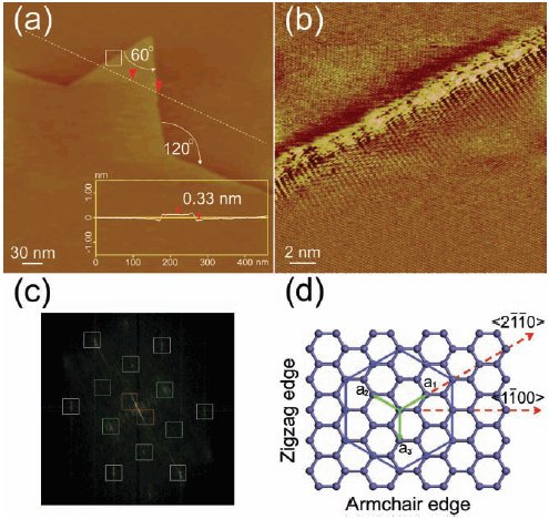 圖3 氫等離子體刻蝕出的單層正六邊形孔洞邊緣的掃描隧道顯微鏡成像(a)恒流模式高度像,(b)原子分辨像,(c)二維傅里葉變換圖,顯示出刻蝕得到的近原子級規則的邊緣與zigzag取向<2-1-10>平行,且在邊緣處觀察到了駐波。(d)對應的結構示意圖。