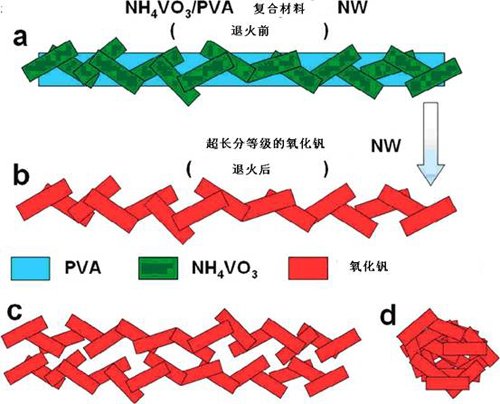 圖1. (a、b)退火時超長分等級的氧化釩(V2O5)納米線形成的圖示說明,(c)二種超長分等級的氧化釩(V2O5)納米線彼此間的側面圖,(d)短的氧化釩納米棒的自聚集