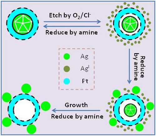 在過去的20年里,科學家已經發展了很多材料作為犧牲模板來制備空心或搖鈴型納米材料,例如聚合物和無機納米微球、液滴、囊泡和微乳液等。但是這些制備方法大都具有系統特異性,對金屬氧化物比較成功,但難以推廣至各種貴金屬材料。還有一些特殊途徑,例如電置換反應(galvanic replacement reaction)、可肯特爾效應(Kirkendall effect)、奧斯特瓦爾德熟化(Ostwald ripening)和層層自組裝(layer-by-layer assembly)等,也能夠用來制備空心和搖鈴型結構納米材料,但這類方法的應用范圍有限,通常伴隨一些難以避免的不足之處。例如,電置換法難以推廣至Au、Pd和Pt之外的金屬,奧斯特瓦爾德熟化過程局限在制備內核和殼層組成成分相同的材料且殼層的結構和厚度難以控制。時至今日,發展一個普遍化的方法制備空心和鈴鐺型貴金屬納米材料仍是納米科學技術領域的一個挑戰性課題。
